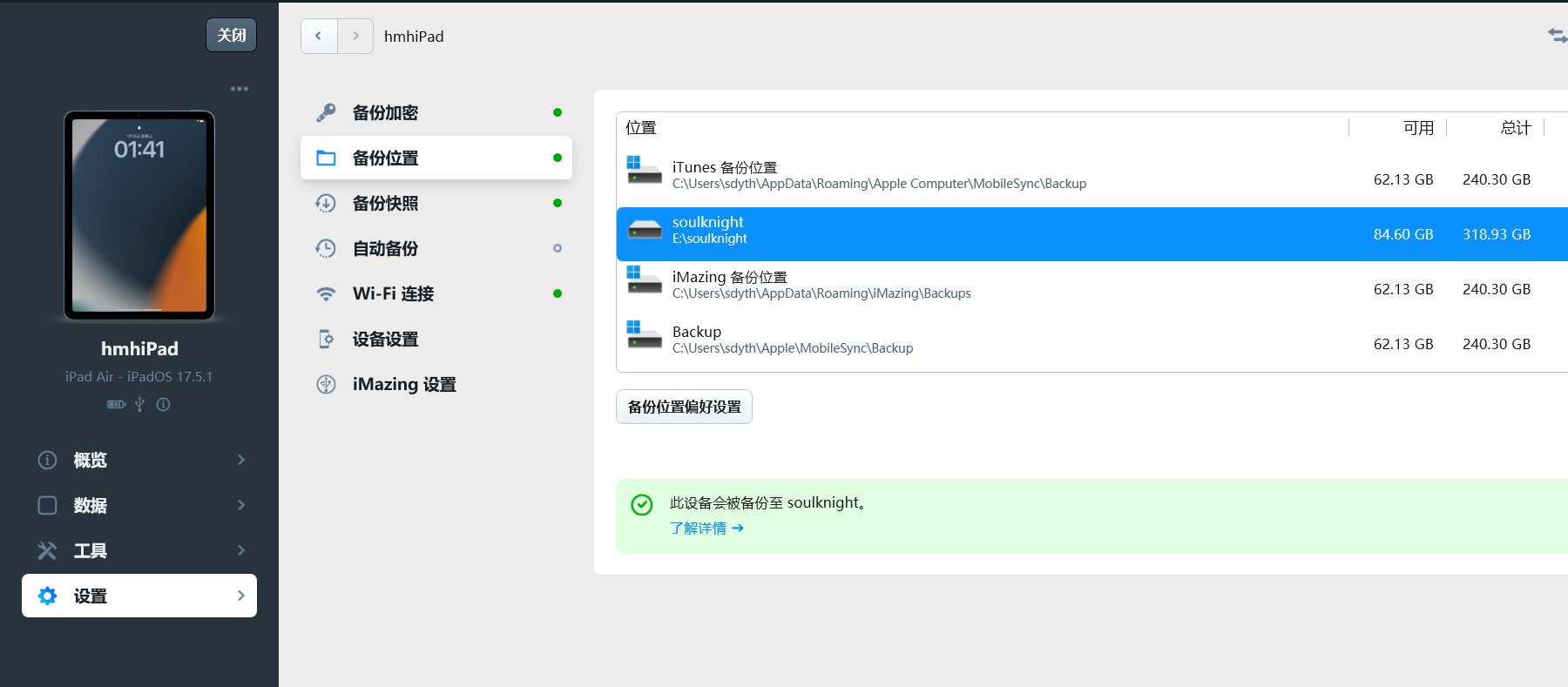 补充:注意imazing的备份逻辑是,先备份设备中的所有文件,然后从备份中提取应用的数据,为了保证能够顺利的备份设备中的所有文件,在左侧栏的设置中,备份位置要选择一个空间足够的磁盘,如下图,这也是为什么要选择一个没怎么存储东西的设备进行操作的原因